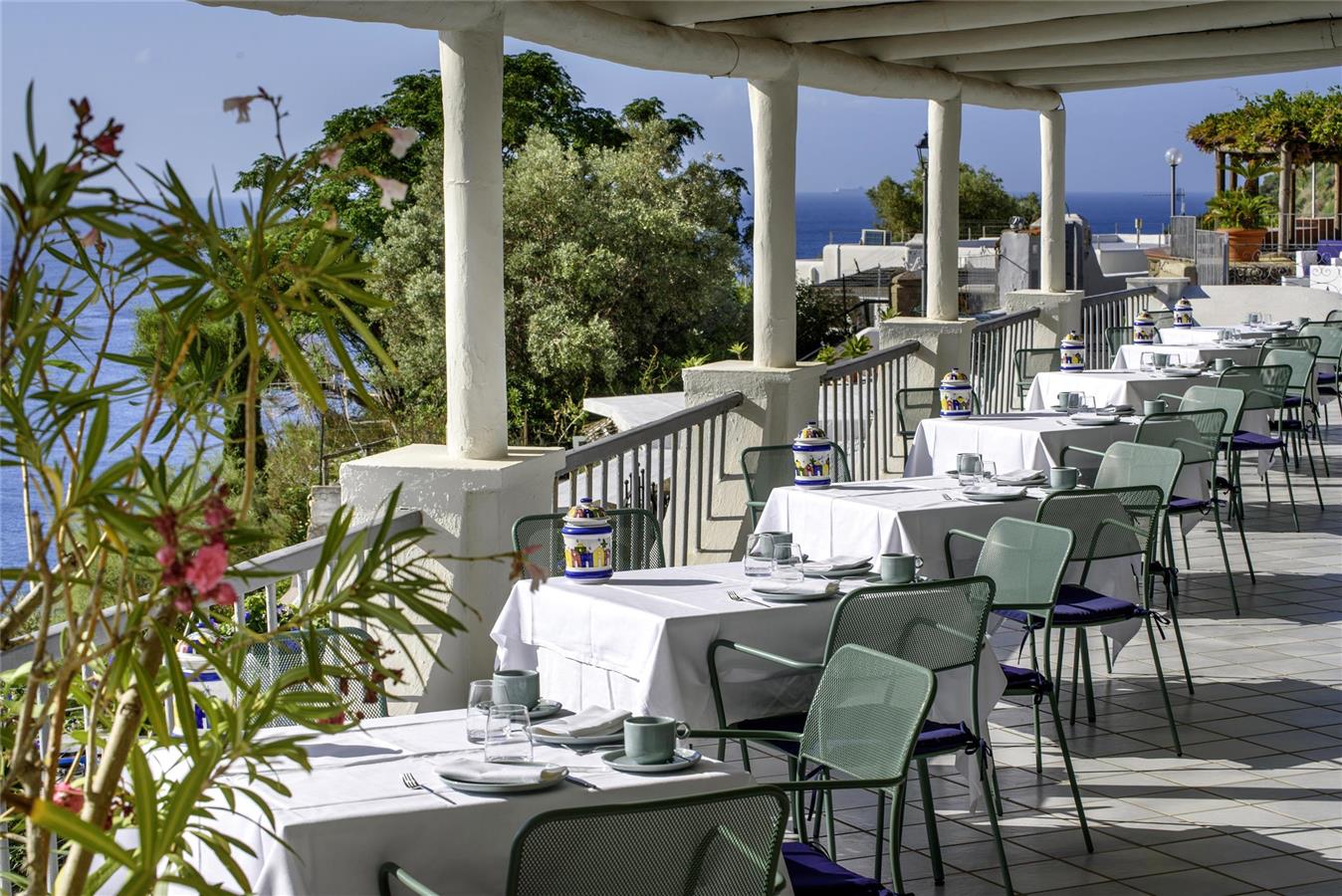Das Panoramarestaurant serviert traditionelle lokale und mediterrane Küche, zubereitet aus frischen Zutaten der Region und serviert auf einer Terrasse mit Meerblick.