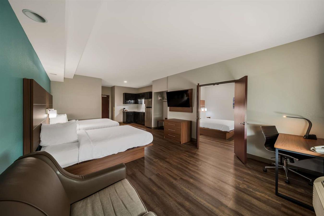 Spacious rooms include smart TVs, blackout curtains, kitchenettes or full kitchens, and plush bedding for a restful night.