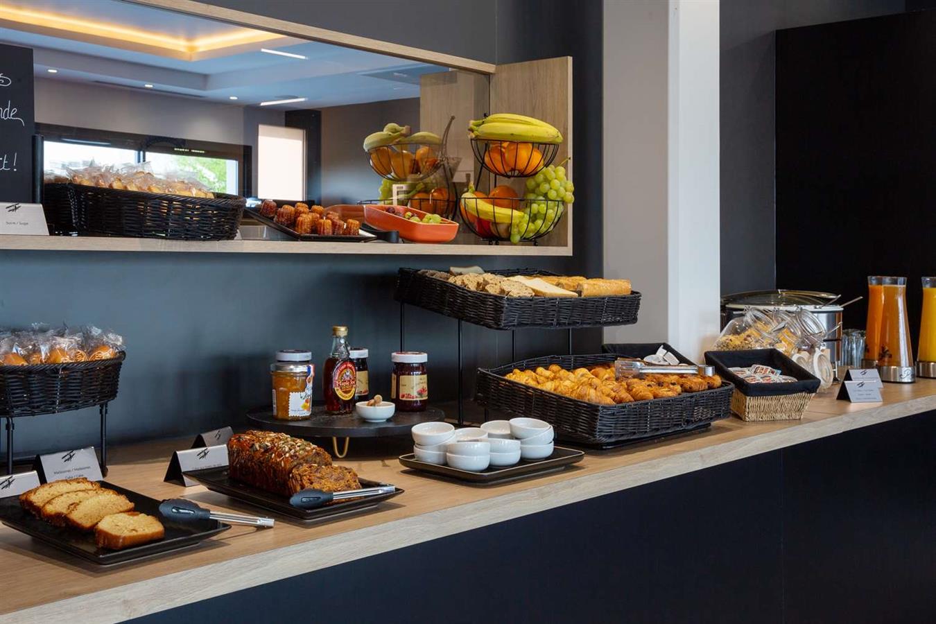 On the menu: hot and cold beverages, bread and pastries, variety of fruit and fruit salad, dairy products, cereal, scrambled eggs, and charcuterie.