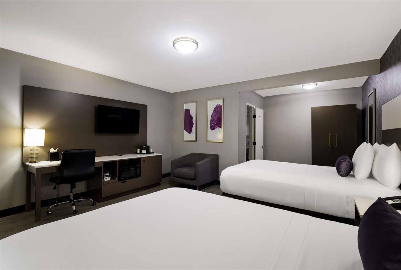 Each room also includes an inviting bathroom with rain shower heads, a 40-inch flat screen TV, a refrigerator, a microwave, a coffee maker, a hairdryer, and a spacious work desk with an ergonomic chair for a more comfortable stay.