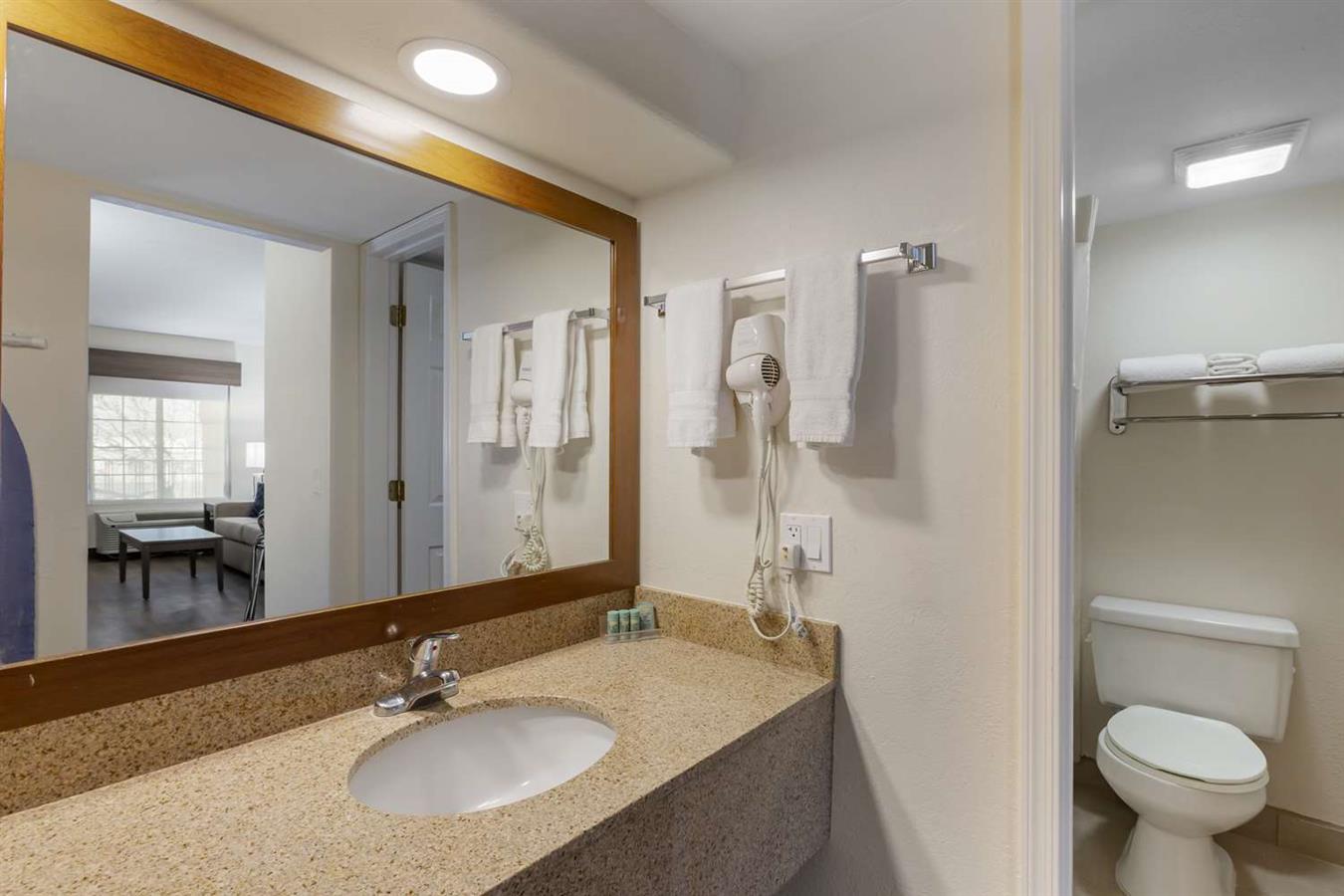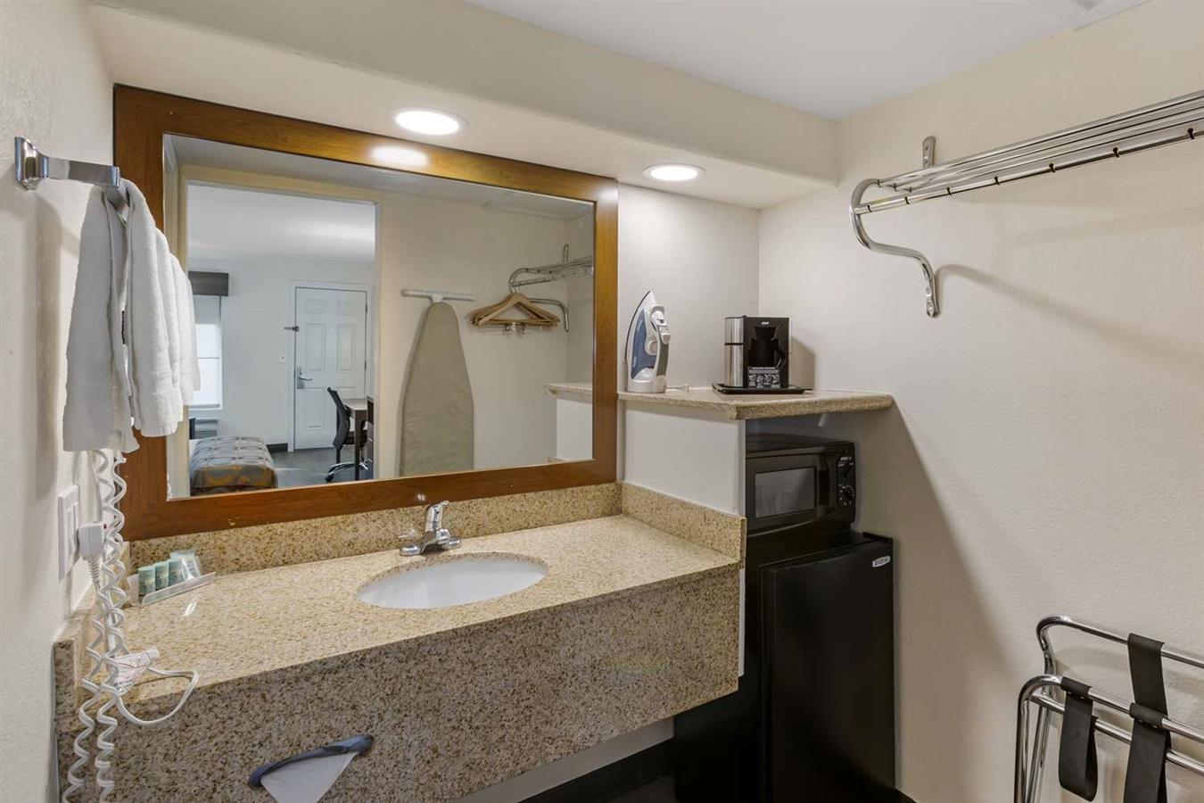 Guest rooms are equipped with plush bedding, flat-screen TVs, microwaves, and mini fridges to ensure comfort and convenience.