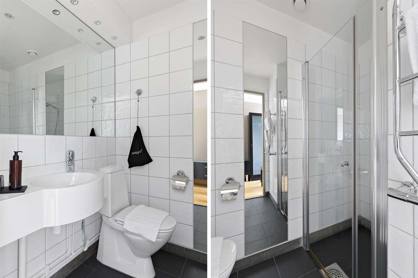 The bathroom is equipped with a shower and a hairdryer.