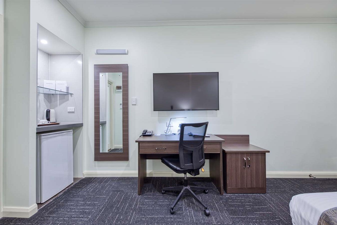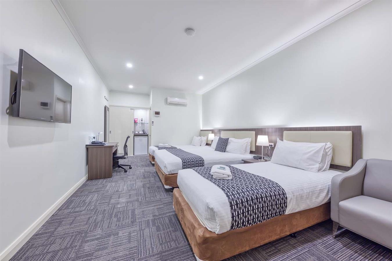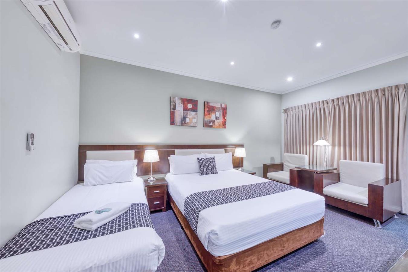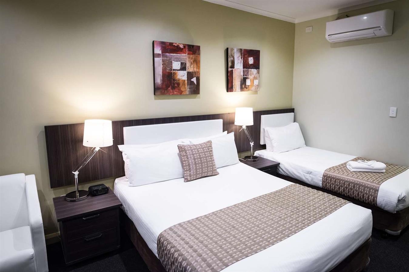 Todas las habitaciones cuentan con camas de matrimonio grandes, televisión por cable con Foxtel, acceso a Internet inalámbrico y aire acondicionado de ciclo inverso.