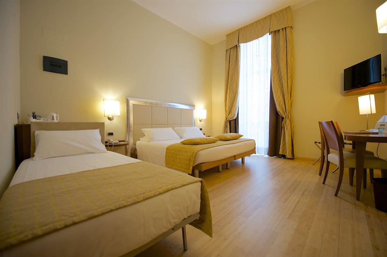 1 queen size bed and 1 single bed, standard triple room, 3 single beds on request, 20 sqm, Sky channels, Wi-Fi, tea and coffee making facilities, non-smoking rooms