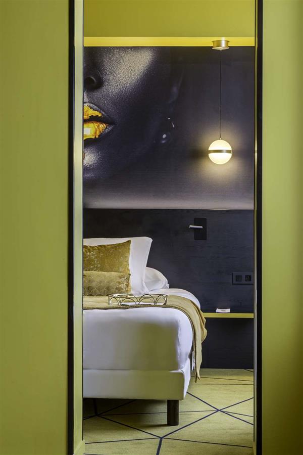 Moderni affreschi grafici che ricordano lo spirito delle incisioni del passato adornano le testiere retroilluminate dei letti.